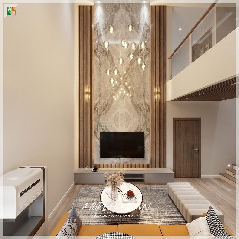 Ý tưởng thiết kế nội thất sử dụng phong cách hiện đẹp cho phòng khách căn hộ chung cư thông tầng.